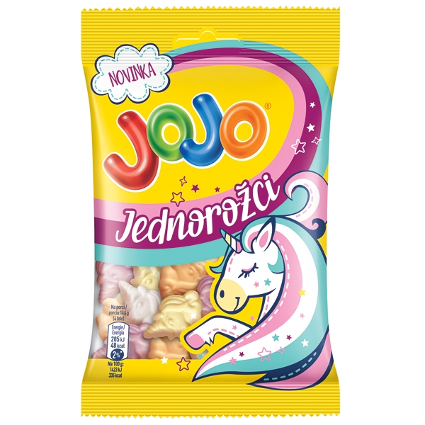 Popis: JOJO Jednorožci pěnové želé bonbóny s příchutí broskve, maliny, citrónu a grepu.