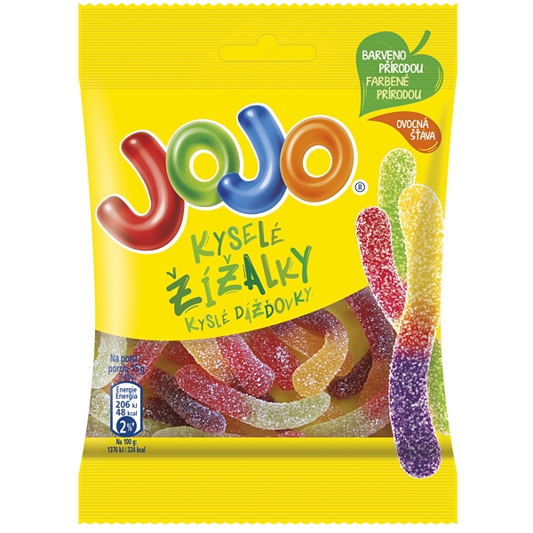 Složení: Glukózový sirup, cukr, pitná voda, modifikovaný bramborový škrob, želatina, jablečná šťáva z koncentrátu 2,5 %, kyseliny (kyselina mléčná, vinná, jablečná, citronová), rostlinné koncentráty (mrkev, ibišek, světlice barvířská), extrakt ze spiruliny, sirup z invertního cukru, aromata (malina, jablko, černý rybíz, citrón), regulátor kyselosti (askorban sodný), barviva (karoteny, kurkumin)