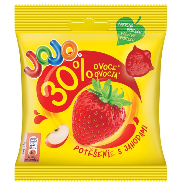 Složení: Glukózový sirup, cukr, koncentráty ovocných pyré 11 % (jablko 8 %, jahoda 3 %), želatina, kyseliny (kyselina jablečná, vinná, citronová), koncentrát šťávy z černé mrkve, regulátor kyselosti (askorban sodný), aroma (jahoda), palmový olej 0,1 %***, lešticí látka (karnaubský vosk), barvivo (karoteny)