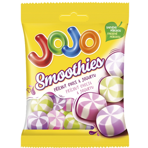 Popis: JOJO Smoothies jsou mixem bonbonů s jogurtovo-ovocnými příchutěmi. Jemná pěnová textura s příchutí jahody, jablka a černého rybízu v kombinaci s jogurtovou příchutí.