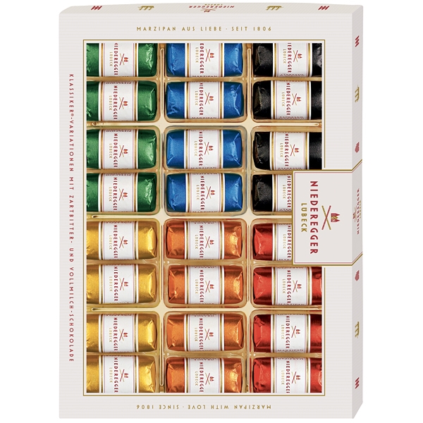 Další informace: Variací marcipánu Niederegger darujete čisté štěstí. Jemné marcipánové pralinky v sobě ukrývají 6 různých druhů chutí. Zakousněte se do nich a zažijte chuť jemné pistácie, ovocného pomeranče, exotického ananasu a silného espressa, doprovázena jemnou hořkou a mléčnou čokoládou. Balení obsahuje 24 jednotlivě balených pralinek.
