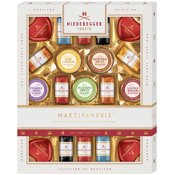 Další informace: Malé poklady s velkou tradicí. Marcipanérie Niederegger nabízí lahodný výběr jemných marcipánových specialit, které jsou vyrobeny ze 100% raw mandlové pasty a ohromí svou lahodnou polevou z hořké čokolády. Balení obsahuje 23 jednotlivě balených pralinek a paštiček. Některé i s alkoholem.