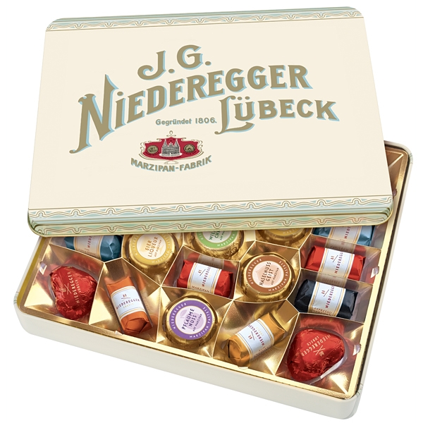 Další informace: Plechová retro dóza ve které naleznete to nejzajímavější od marcipánové legendy firmy Niederegger. Marcipánové paštičky s mnoha druhy náplní zalité v jemné hořké čokoládě. Hruška, pomeranč, švestky v Armagnacu…Dále pak marcipánová srdíčka zalitá jemnou hořkou čokoládou a mini marcipány s příchutí. Balení obsahuje 23 jednotlivě balených pralinek a paštiček. Některé i s alkoholem.