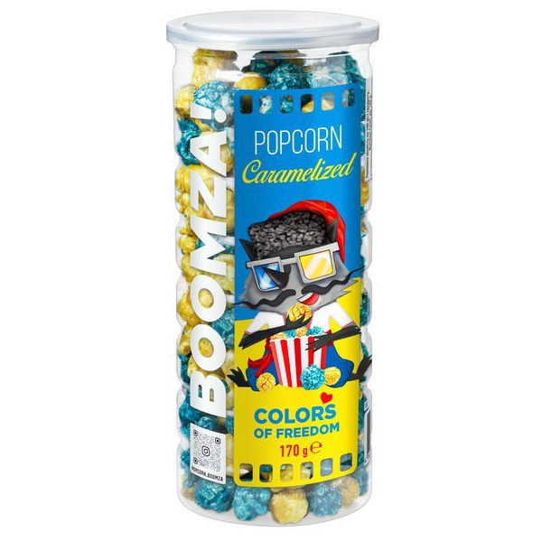 Popis: Boomza karamelizovaný popcorn s příchutí višní a karamelu \"Colors of Freedom\"