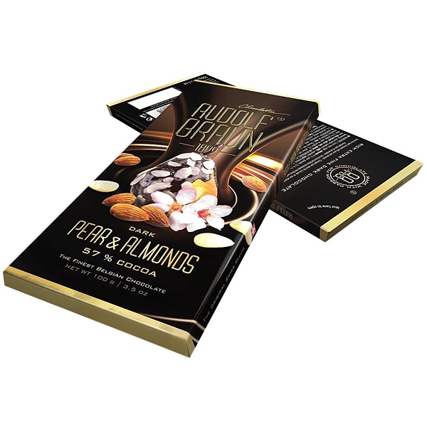 Další informace: Bohatá jemná hořká belgická čokoláda s hruškou a mandlemi s vysokým obsahem kakaa 57%. Výjimečně delikátní čokoládový počin. „Hrušková s mandlemi“ z dílny Rudolfa Brauna je zvláště při prvním ochutnání něco nečekaně příjemného. Zachovává si vyšší obsah kakaa. Plná chuť hrušky vnáší do požitku jistou veselou vzpruhu, od které Vás příjemně, galantně odpoutávají kousky krájených mandlí. Tato čokoláda je nejvíce oceňovaným vzorkem při našich ochutnávkách.