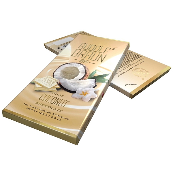 Popis: Belgická bílá čokoláda s kousky kokosu